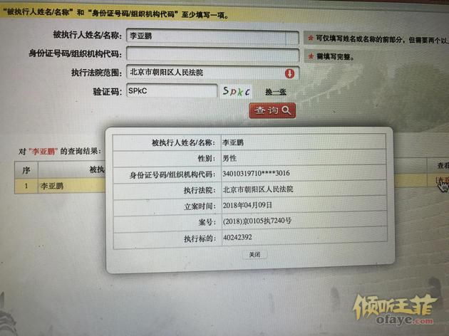 李亚鹏公开的出生日期吻合),显示立案时间是2018年4月9日,执行法院为朝阳法院,案号为(2018)京0105执7240号。新京报记者发现,在“失信