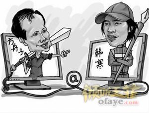 1月15日——方韩之争2012年1月15日,麦田发表《人造韩寒》,质疑韩寒有代笔,韩寒在16日提出悬赏2000万找代笔证据之后,18日,“打假名士”方舟子加入战局, 在自己的微博上发表一系列文章,指出韩寒作品有“代笔”“水军”“包装”的嫌疑。这次事件在网络上引起巨大争议。有人支持韩寒,认为方舟子行为属“有罪推 理”,而也有人认为这是正常的质疑,应当鼓励。同时,对于方舟子的行为究竟是属于合理的质疑和文学批评,还是属于侵犯他人荣誉权、构陷,甚至故意抹黑,不 同方的支持者对此都有明显不同的解读。