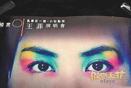 范玮琪的五彩眼妆。被批抄袭天后王菲造型。中新网7月15日电 范玮琪(听歌)(范范)11月1日将办演唱会,她的演唱会海报造型,却被网友批评抄袭天后 王菲(听歌)《寓言》专辑的眼妆。