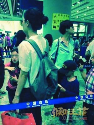 王菲穿着休闲短袖上衣,独自背着双肩包,正笑容满面地过边检,女儿
