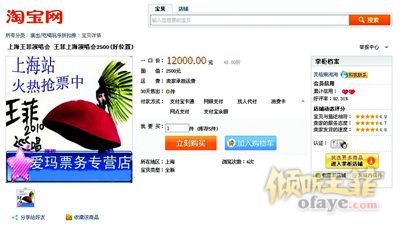 记者昨日在淘宝网上键入“王菲 演唱会”的关键词查询,王菲京、沪十场演唱会各场各档的门票应有尽有。北京站原价为300元的看台票已被抬到了500元,原价500元的被抬到了750元;上海站原价为500元的看台票最高售价已达到800元。王菲演唱会的六档门票中,原价2500元的位置是最好的,在北京场,这档门票也是唯一的内场票。黄牛喊出的最高价格达到12000元。