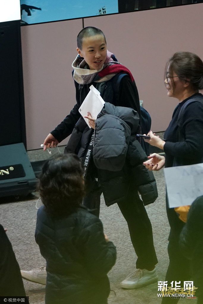 2017年12月18日,窦靖童现身机场眉飞色舞,剃光头萌生三分喜感。