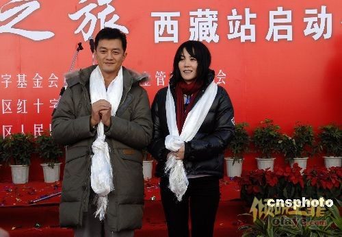 11月28日下午,中国红十字基金会嫣然天使基金“天使之旅——把爱传出去”医疗救助行动西藏站启动仪式在西藏自治区人民医院举行。仪式前,中国红十字基金会副秘书长刘选国和李亚鹏、王菲夫妇到医院病房看望了第2008名受助患儿岗琼尼霞和其他9名住院患者;仪式后,他们带着礼物和祝福来到贡桑家中,看望术后出院的受助患儿岗拉央金。中新社发 龙昊 摄