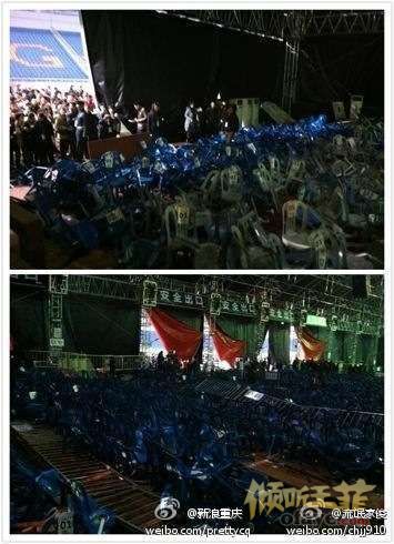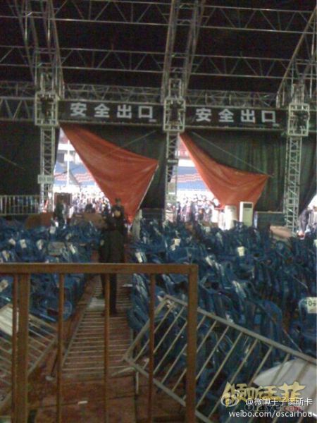 17日晚20时许,王欢、?t?ⅠR里?W、CBI余浩等众多微博网友发微博称,王菲个唱观众席发生坍塌事故。当时,组委会紧急处理现场,并疏散现场人群,通知暂时离场。