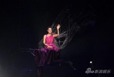 王菲乘坐在一个缀着金属翅膀的秋千里从各个方向向观众挥手,伴随着《天空》的旋律,身穿紫色斜肩长裙的