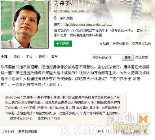 事件起因“我是有才哥”煽风,方舟子王菲微博“起火”2月6日20时03分,王菲在其微博上转了网友“我执难破”的一条微博,并对微博中“木制佛像在大火中竟然丝毫无恙地屹立在夕阳中”发表评论,写道:“无以言表,不可思议,顶礼遍知佛尊。”该评论被网友“我是有才哥”转给了方舟子,并问方有何看法,方舟子立即发表评论道:“还有无数尊葬身火海的佛像你也别忘了顶礼。谁要觉得这尊佛像不可思议的,拿来点把火试试?”王菲随即响应,质问方舟子:“你想试什么?能不能点着么?”方舟子再次“回击”,表示要用“实验检验传奇”,“战火”一点即着。