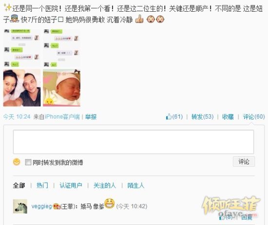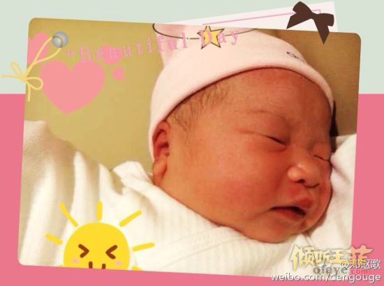 微博晒出一张新生儿的照片以及黄觉和妻子麦子的照片,并爆料称:“还是同一个医院!还是我第一个看!还是这二位生的!关键还是顺产!不同的是这是妞子,快7斤的妞子!她妈妈很勇敢、沉着、冷静。”照片中,黄觉老婆穿着病号服,夫妻两人头挨头躺在床上,黄觉拿着手机自拍,另外一张是黄觉女儿的照片,粉嫩的小脸蛋,熟睡的样子非常的可爱,酷似老爸黄觉,就连王菲也在