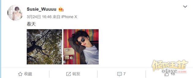 3月24日,李亚鹏女友在微博晒出了一张近照,并配文:“春天”,照片中Susie戴着墨镜躺在一棵大树下,十分悠闲。