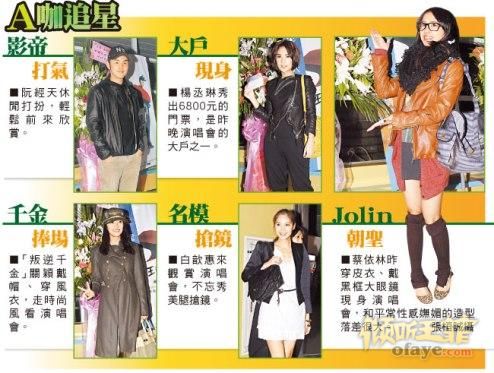 昨晚的演唱会依然星光闪闪,蔡依林、萧亚轩、杨丞琳、张小燕以及新科金马影帝阮经天昨都到场欣赏。昨蔡依林穿着驼色外套搭短裤装,配上流行无镜片黑框眼镜,她说一直喜欢王菲,6年前曾看她台北体育场演唱会。她最喜欢王菲《开到荼靡》等充满摇滚风格歌曲,也曾翻唱过王菲《怀念》,下次希望翻唱偶像歌曲《旋木》,蔡依林说:“我是因为她才学广东话,当时练唱《多得她》。”