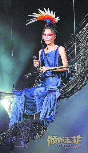 唱《天空》时王菲所乘坐羽毛马车在半空中突然停顿,受到惊吓的她强自镇定