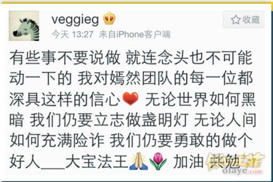关于近日“嫣然”的负面传闻,王菲昨天(2月20日)“开腔”力挺嫣然基金与李亚鹏,投以信任,她写道:“有些事不要说做,就连念头也不可能动一下的,我对嫣然团队的每一位都深具这样的信心,无论世界如何黑暗,我们仍要立志做盏明灯,无论人间如何充满险诈,我们仍要勇敢的做个好人。大宝法王,加油,共勉。”