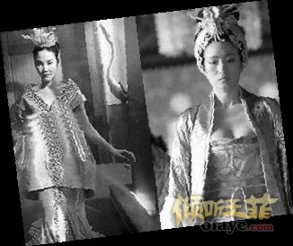 她先是在金碧辉煌的宫廷穿着皇袍、头戴王冠,以一身皇室贵族高雅扮相出场,摘下王冠后,王菲散出一头秀发,一脸享受的样子。其华贵的造型酷似巩俐在《满城尽带黄金甲》中的扮相。