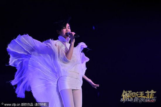 新浪娱乐讯 2011年7月2日, 王菲 长沙演唱会在湖南省国际会展中心上演。王菲天籁之音再现令歌迷陶醉,身穿白裙飘逸唯美,堪比女神下凡。图为天后开唱。