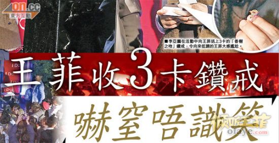 李亚鹏送赠三克拉钻石戒指“香榭之吻”给予王菲,令向来低调的她显得尴尬。新浪娱乐讯 北京时间11月4日消息,据香港媒体报道,不经不觉,王菲与李亚鹏已经结婚七年了,向来一家四口乐也融融,但近来婚变消息愈传愈旺,但无阻两夫妻连日来恩爱出巡帮小女儿李嫣宣传画展。李亚鹏前晚(11月2日)还突然公开送赠三克拉钻石戒指“香榭之吻”给予爱妻,向来爱低调的王菲,立刻楞了一下,露出惊愕表情。