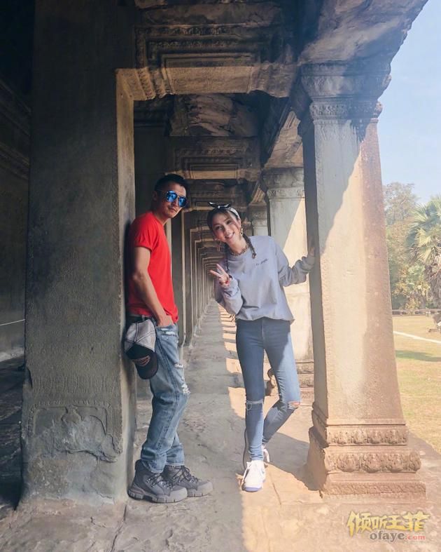身处国外,两人一左一右靠在柱子旁,笑容开心。