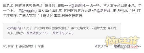 【微博节选】@veggieg:完了 听说郭老师来围脖界圈地了 浮云社堪忧啊~转念一想 织围脖这么女红滴干活 郭老师还真不一定有那么细的针脚~ 呵~