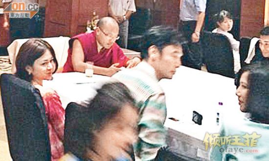 法王在晚宴现身,王菲站在前排正中央位置与法王面对面交谈,在旁分别还有刘嘉玲与赵文卓夫妇。