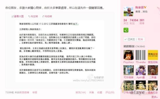 以下为陈家瑛声明全文:由于意外刚刚发生,目前仍未太清楚状况,有关单位正在协助疏散现场近万名观众。据了解今天晚上八时十分左右,面对舞台右方的观众席于建搭上出现了问题,部分于离地一尺半的“架高座位”的观众席往下塌,引至观众受到惊吓,做成局部混乱。主办单位鉴于当时情况,马上暂停演唱会,疏散人群。