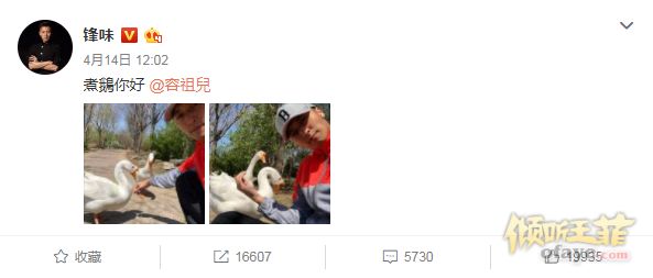 容祖儿 [微博]的互动也让人捧腹不已。他穿着冲锋衣蹲在地上,跟两只大白鹅自拍,直男的迷之自拍角度暂且不提,自拍的配文居然是:“煮鹅你好。”