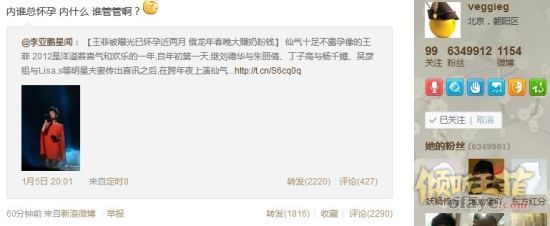 此番王菲再度被曝怀孕,报道指据80后知名争议作家独孤意爆料,在一直希望有个儿子的李亚鹏的多方努力下,王菲终于成功怀孕五十多天,并打算借龙年春晚孕期复出大赚奶粉钱。但是就王菲参加跨年夜晚会时演唱“神曲”《愿》的状态看来,王菲仙气十足但是孕像全无。王菲也于今天10点56分在新浪微博中无奈表示:“内谁总怀孕 内什么 谁管管啊?”并贴上一个不想搭理的哼哼表情。