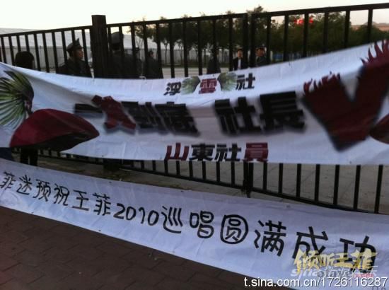 新浪娱乐讯 北京时间10月29日晚20时,王菲“2010巡演”首站即将在北京五棵松体育馆揭开神秘面纱。图为乐迷打出的横幅 。
