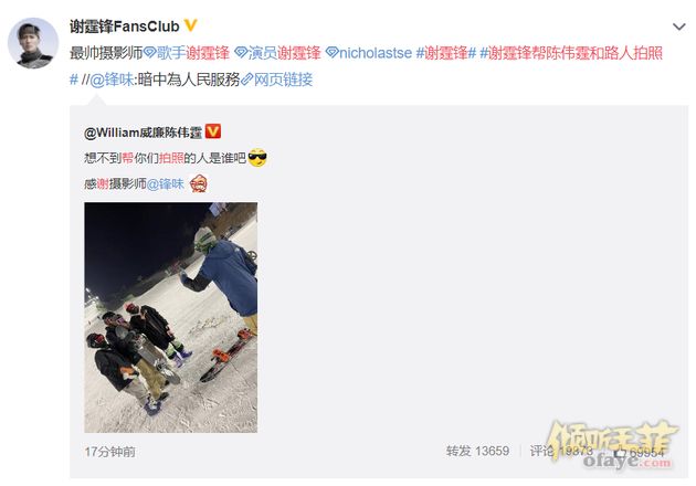 微博晒出路人在滑雪场偶遇自己的照片,表示:“想不到帮你们拍照的人是谁吧感谢摄影师”。