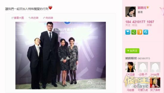 刘嘉玲微博截图新浪娱乐讯 日前,刘嘉玲(微博)、杨澜(微博)、姚明、周立波(微博)等一众明星一起出席了上海特殊关爱基金会发起的慈善晚宴。活动后刘嘉玲于11月27日20点41分在其新浪微博中上传了与众星的合影。合影中杨澜与刘嘉玲都身着深色裙子,十分优雅,在姚明的面前都显得十分娇小。一旁的周立波笑着使劲的昂着头试图与姚明比肩,只可惜心有余而身高不足。