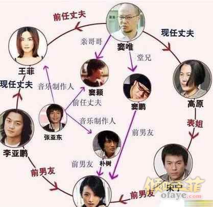 窦靖童姑姑窦颍的前夫;张亚东的前女友是瞿颖,瞿颖的前男友又是李亚鹏。