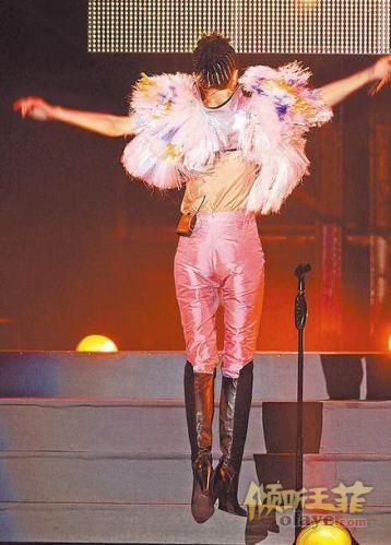 王菲昨唱到春天段落时,因风吹裙摆高飞,观众大叫,深怕她走光,其实她长裙摆下另有一条黄色小短裙,安全无虞。