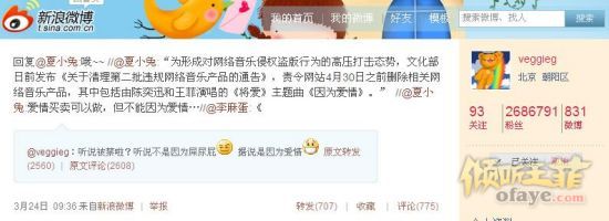 日前,文化部为形成对网络音乐侵权盗版行为的高压打击态势,发布了《关于清理视频:将爱主题曲《因为爱情》 王菲陈奕迅合唱媒体来源:新浪娱乐第二批违规网络音乐产品的通告》,责令网站4月30日之前删除相关网络音乐产品,其中包括由陈奕迅和王菲演唱的《将爱》主题曲《因为爱情》。昨天9时16分,王菲就在微博中回应了此事:“听说被禁啦?……据说是因为爱情。”说得倒是挺恶搞的,但也不难看出天后的些许情绪,歌迷更是在微博中力挺她和歌曲。