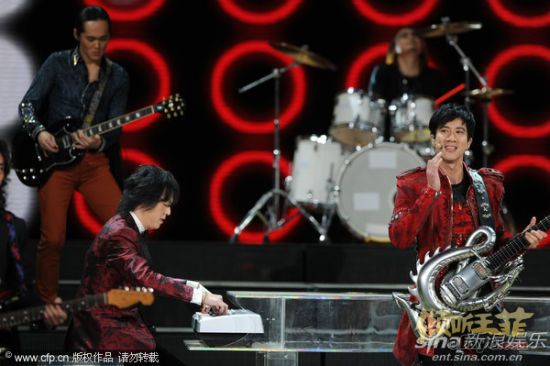 王力宏、李云迪帅哥搭档两位“乐坛王子”王力宏、李云迪的联手合作也是今年春晚的一大看点,现场效果也颇具感染力。舞台上摆放两架钢琴,一身白色西装的李云迪,安静地坐在钢琴前,随即来上一段《金蛇狂舞》,随后王力宏也弹起《金蛇狂舞》,两人似有“斗琴技”的意思。配搭着这样优雅画面的演出,他们的身后出现3D影像,从中见到黑白键组成的画面在他们的身后跃动“起舞”。而“斗琴”也还只是前奏,王力宏再登上身后的高台,高歌一曲重新编配的经典歌曲《龙的传人》。王力宏和李云迪的首度舞台合作也为网友津津乐道,认为两位帅哥的搭配很有视觉美感。