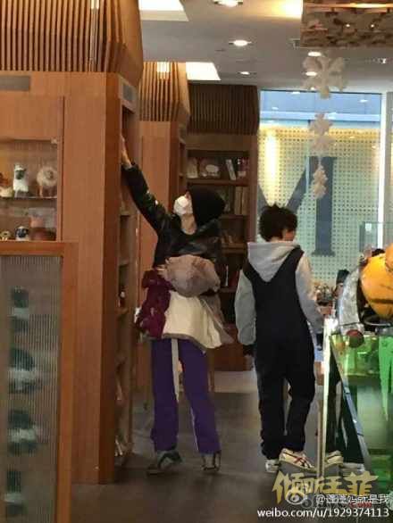 王菲穿着黑色上衣,头戴绒线帽,白色口罩遮面,怀里抱着小孩的衣服,在书店选购书籍,第一张照片中