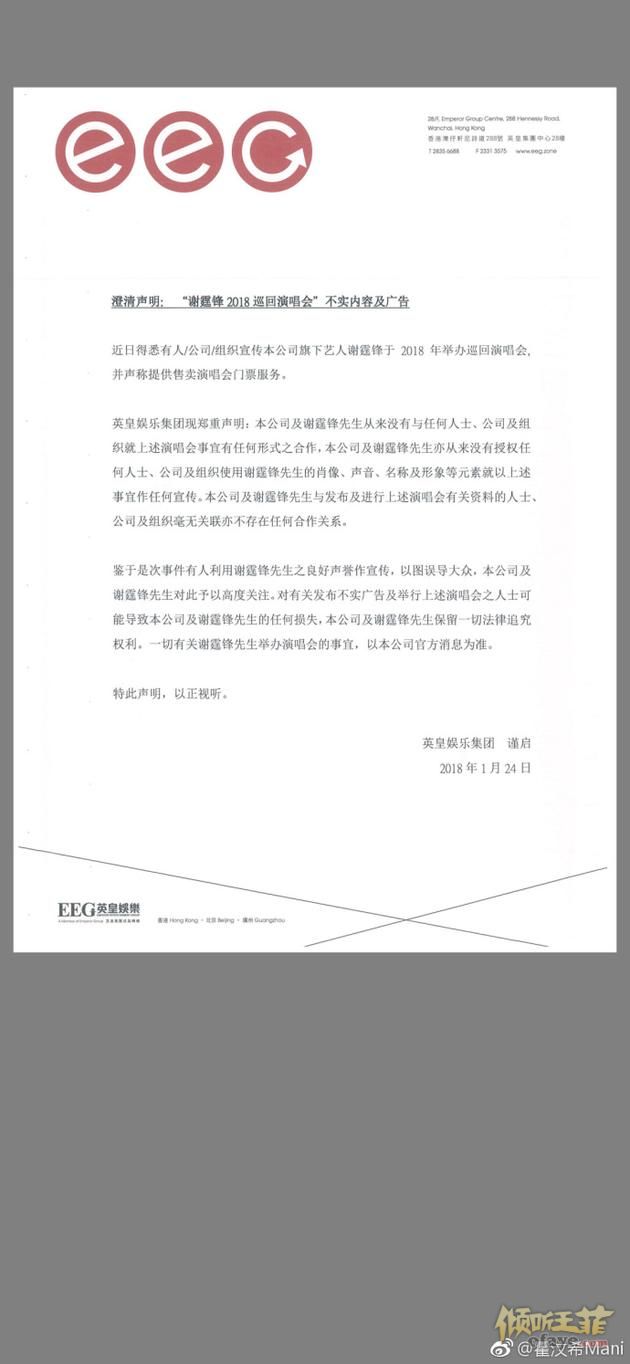 1月24日晚,谢霆锋经纪人霍汶希通过微博发表声明,对近日传言谢霆锋将开巡回演唱会做出回应澄清,称:“公司与谢霆锋先生从来没有与任何人士、公司及组织就演唱会事宜有任何形式的合作,也从未授权任何人士、公司及组织使用谢霆锋先生的肖像、声音、名称及形象等元素事宜做任何宣传,与演唱会有关资料的人士、公司及组织毫无关联亦不存在任何合作关系。”并称将追究法律责任,称:“对有关发布不实广告及举行演唱会人士可能导致的任何损失,公司和谢霆锋将保留一切法律追究权利。一切有关谢霆锋先生举办演唱会的事宜,以本公司官方消息为准。”