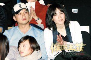 本报讯 昨日晚,在北京,李亚鹏、王菲共同出席《将爱情进行到底》话剧的首映仪式。李亚鹏穿着休闲装,王菲穿着黑色大衣,脚下穿着黑色丝袜秀美腿,难敌寒冷的她右手紧紧拽紧衣服保暖,默默跟在李亚鹏身后,二人刻意保持距离极为低调,但王菲在台下看戏时小动作颇多,背夫挖鼻、发短信、捂脸打电话,简直忙得不亦乐乎,还不时刻意秀婚戒。难怪有记者说昔日的天后如今已变妖婆。