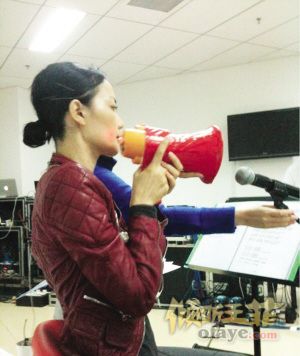 照片中可以看到,王菲在很认真地记歌词。当然,天后也不改搞笑本色,拿着话筒唱完之后,她还拿出一个喇叭,显得很可爱。