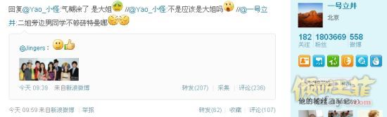 3月25日上午9点39分,王菲的女儿窦靖童在微博上发布了一张合影照片,看内容应该是同学聚会后的合影。窦靖童把头靠在了旁边男同学的肩上,显得十分亲密。李亚鹏在微博上回复,“二姐旁边男同学不够砖特曼(绅士)哪。”这时候有网友提醒李亚鹏,“不是应该是大姐吗。”他连忙纠错,“气糊涂了,是大姐。”截至发稿前,这条微博转发了181条,评论210次。