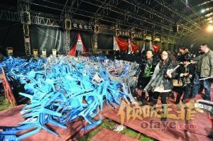 垮塌:施工安全未按标准据《新京报(微博)》报道,现场观众魏军透露,观众席搭建在草坪上,是用脚手架支起来的,上面铺木板,然后密密麻麻排上塑料椅子,离地面约1米高。魏军称,在王菲即将入场前,大部分观众都兴奋地站了起来欢呼,可能因为观众整体的起立坐下,造成座位脚手架晃动,紧接着散开。他看到E、F区先后坍塌,他所在的G3区也跟着坍塌,现场坍塌面积“有几百平方米”。他的膝盖被夹在脚手架中间,造成膝盖皮肤脱落。